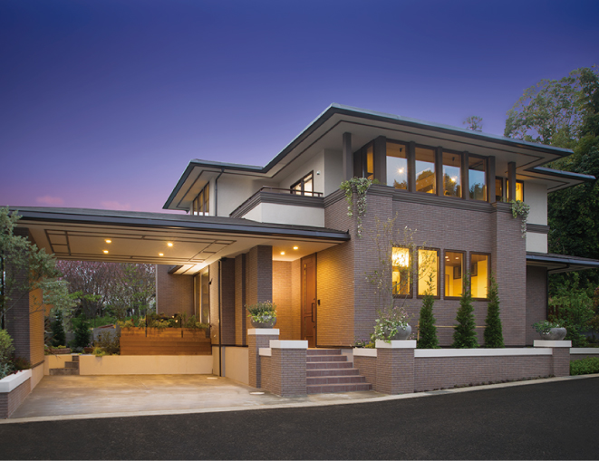 伸びやかな水平線と垂直線が織りなす重厚感。建築家フランク・ロイド・ライトのプレーリースタイルを継承した邸宅は、流行に左右されない普遍的なデザインと、自然の光や風を活かすことで生まれる心地の良さが特徴です。