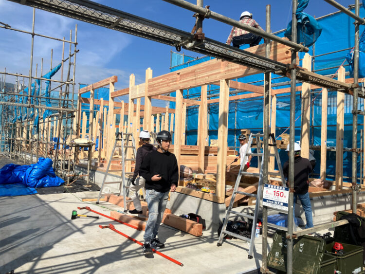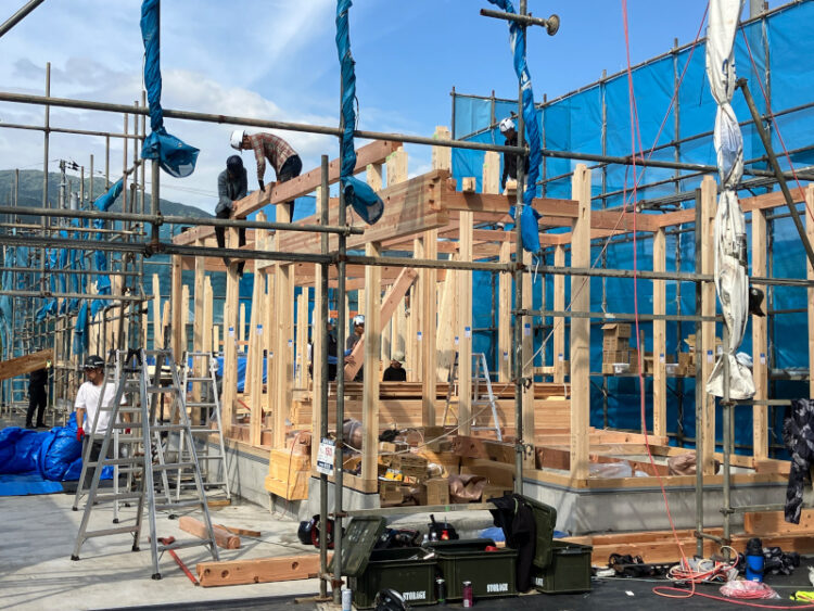 大勢の大工さんが集まって、柱と梁を1本1本組み上げて行きます。