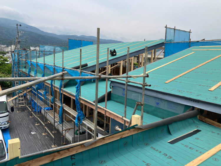 いち早く屋根防水下地を施工し、、ブルーシートで養生して作業終了です。