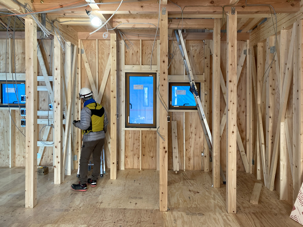 外周に窓が設置され、耐震用の筋交いが取りつけられました。