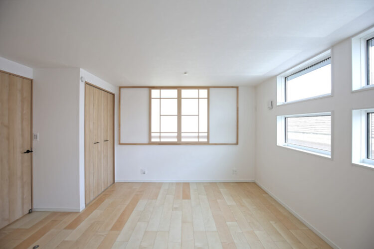 オリジナルデザインの障子窓で吹抜けのリビングと繋がっています。