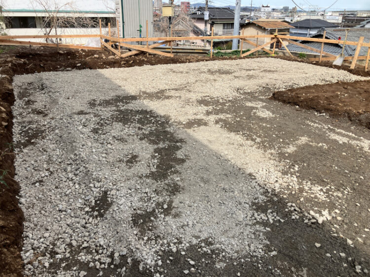砕石を敷き詰め転圧し、基礎の下地を作ります。