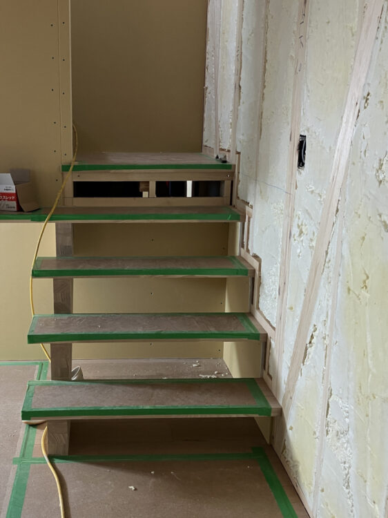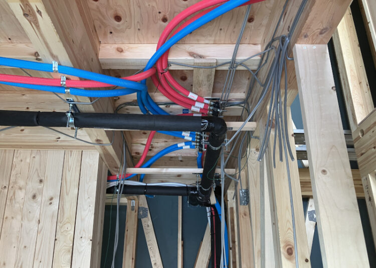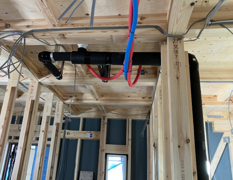 吹付断熱工事に先立って、給排水配管と電気配線を敷設しました。