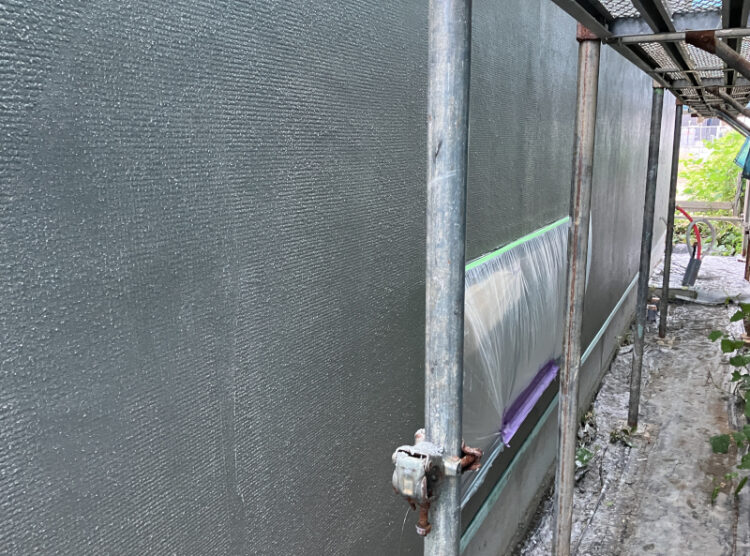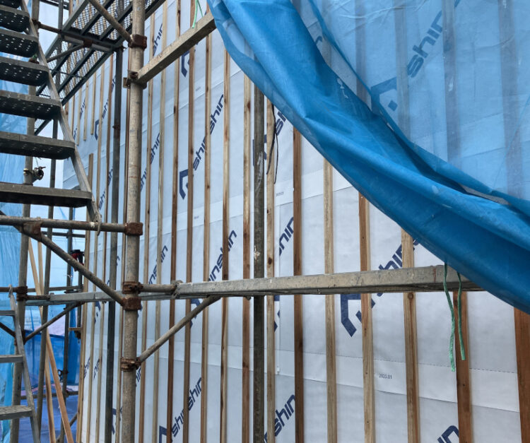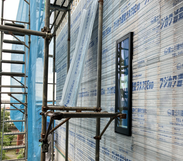 透湿防水シート、通気胴縁、下塗り、中塗り、グラスファイバーネット、仕上げ塗り。すべて左官屋さんの手仕事です。