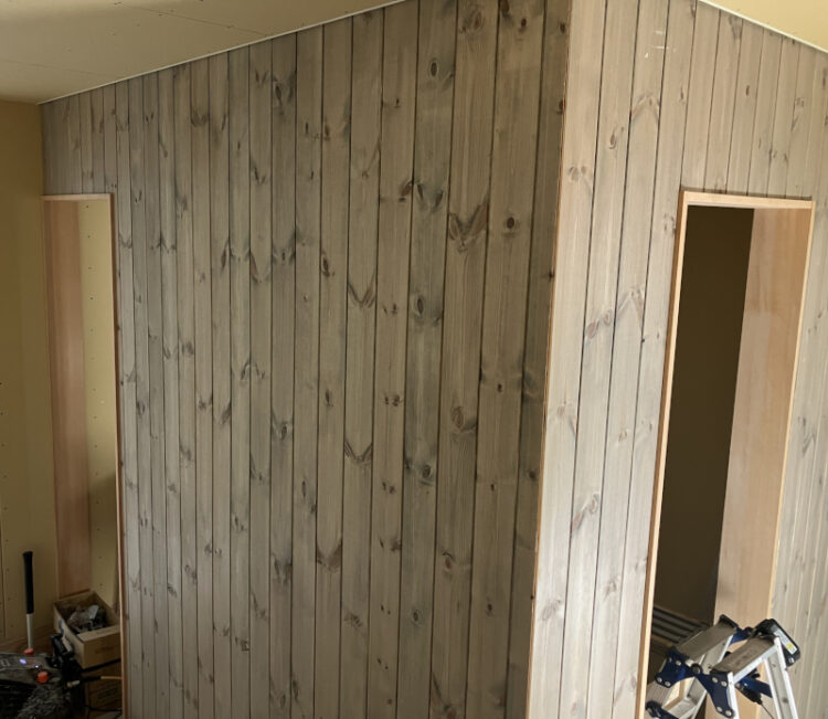 新進建設オリジナル建材のパイン材を大胆に着色。