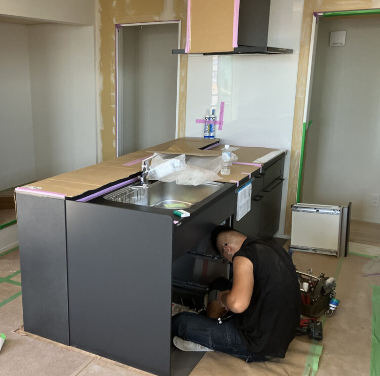 設備屋さんがシステムキッチンを、丁寧に仕上げてゆきます。