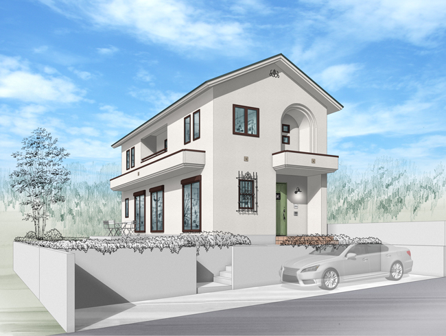 ・落ち着いた暖色系の外壁とリーフグリーンの玄関ドアが外観のアクセントです。