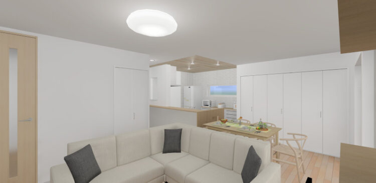 LDKは白を基調とした清涼なスペースです。キッチン天井にはパイン材、背面にはグレーのタイル模様のクロスを採用し、メリハリをつけています。また、時間が経つと黄色が入って、より温かさを感じられる空間となります。