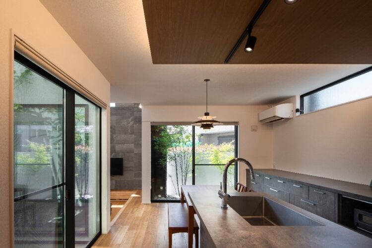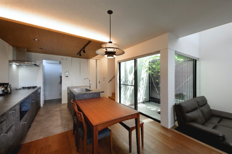 リビングからダイニングキッチン・中庭を望む
