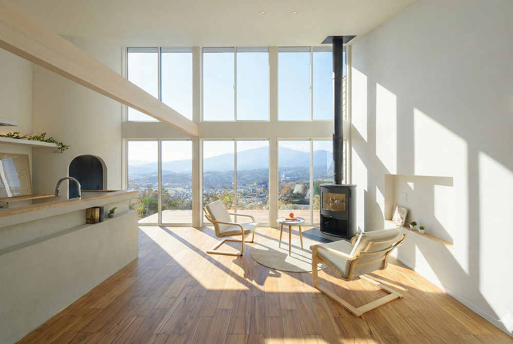 自然の眺望を抱く平屋で自給自足の暮らしを実現。 太陽光発電×GX住宅の高性能が日常を支え、テレワークと相性の良い静穏な住環境が、移住という新しいライフスタイルを後押しします。