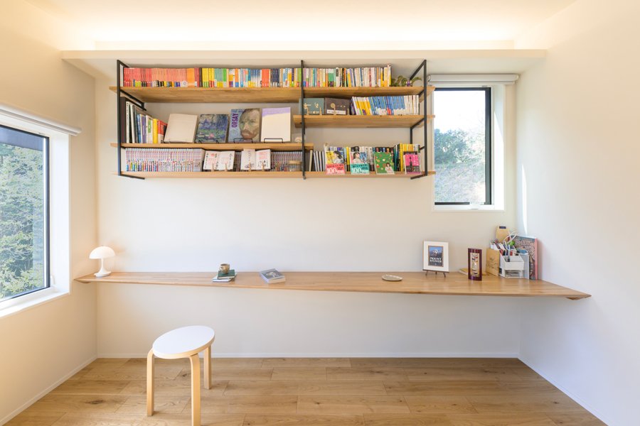 吹き抜け勾配天井でLDKと緩やかにつながるセカンドホール兼ライブラリー。自然を望み、本を広げる場所。