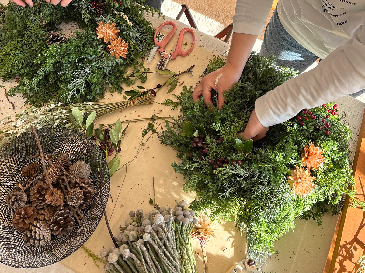 ゆったり会話を楽しみながら、思い思いのリースが形になっていきます。