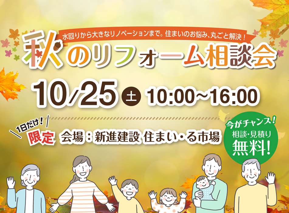 水回りのリフォームから大きなリノベーションまで、住まいに関するお悩みを丸ごと解決できる「秋のリフォーム相談会」を開催します。