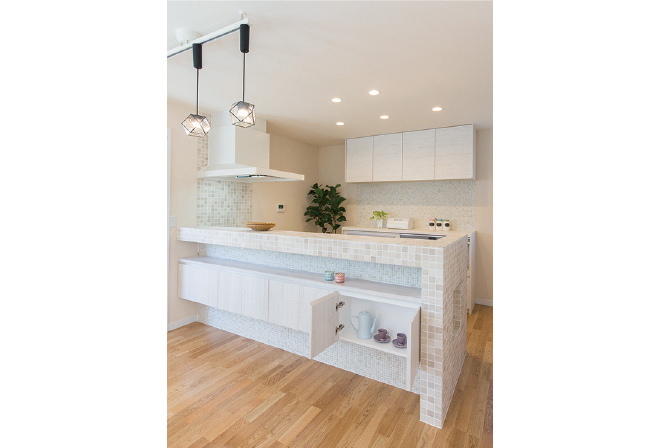 モザイクタイルの造作キッチンカウンターは、家族との会話が弾む対面式。キッチンカウンターの下にも収納棚を設けました