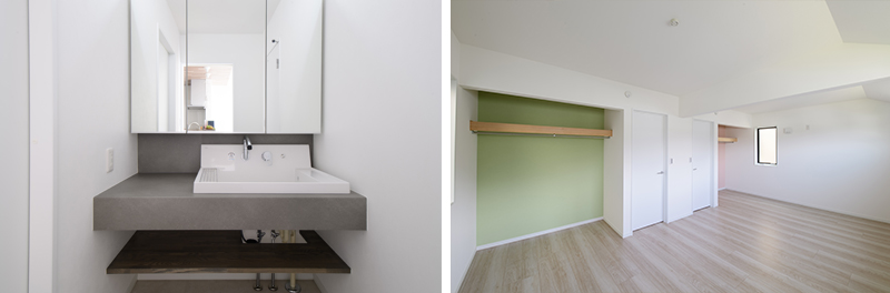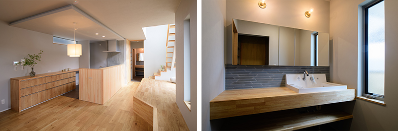 LDKには、ベンチや収納、くつろぎの場として多彩に使える小上がりスペースを設置。2階へと続く階段とも一体化させ、空間に奥行きを持たせました。また、洗面スペースには、既製品を活用しつつタイルや照明をデザインし、ダークグリーンの窯業タイルが映える、大人の和モダンな雰囲気に。
