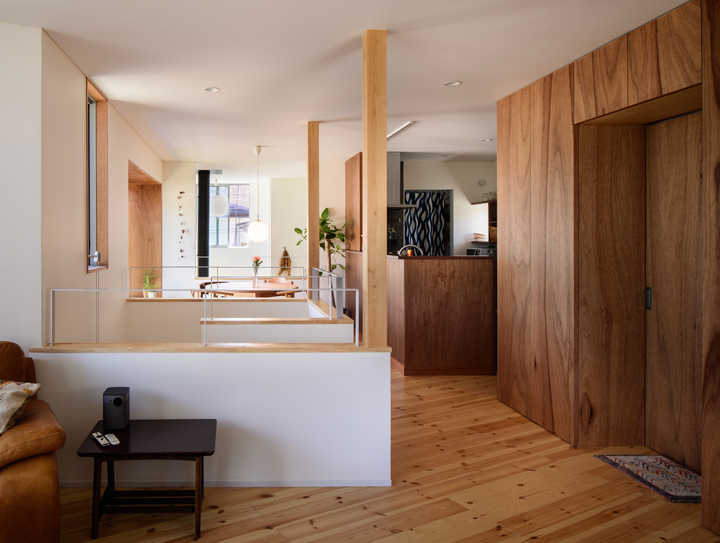 階段を上がるとリビングダイニング・キッチンへと続きます。こちらは階段上がって右手側のリビング。一画にはデスクコーナーを設け、ご夫婦が作業できるスペースも。窓から見える景色は隣家のお庭の借景です。収納扉はラワン材で造作しました。