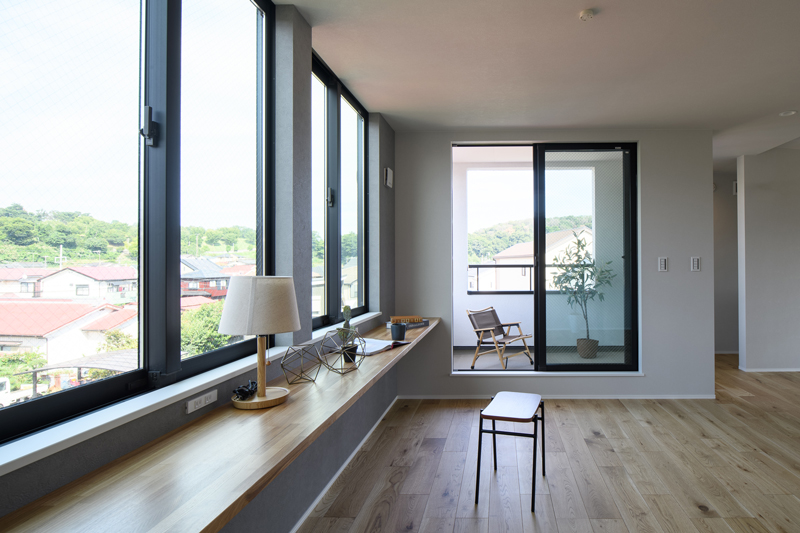 2階のフリースペースには、建築化された長い「造作カウンター」を壁面に設置しています。家具を置く必要がないため空間を広く使え、パソコン作業や絵を描く時間など、ちょっとしたワークスペースとしても活躍。使い方を決めすぎないこの空間は、住まい手のアイデア次第でアトリエにも、ちょっとした運動スペースにもなる、自由度の高い場所です。